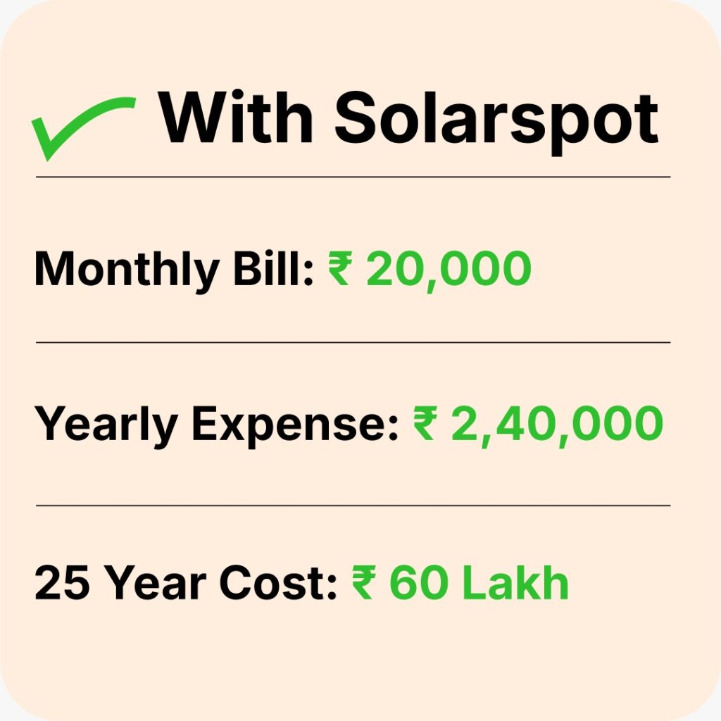 SolarSpot helps businesses reduce electricity expenses with smart commercial solar solutions designed for long-term savings and growth. You can switch to solar without worrying about heavy upfront investment, as we provide customized solar systems for factories, warehouses, hotels, and commercial buildings based on your energy needs. Our aim is simple — to help your business lower power costs, improve profit margins, and gain control over rising electricity tariffs. With flexible solar plans, many businesses start saving from the very first month, often paying the same or even less than their current electricity bill. After the agreement period, the solar system becomes your asset, allowing you to enjoy low-cost or nearly free electricity for the next 20+ years. Built with high-quality components and backed by up to 25 years performance warranty, SolarSpot ensures reliable, sustainable, and future-ready power for your business. Switch to SolarSpot today and turn your electricity expense into long-term financial advantage.